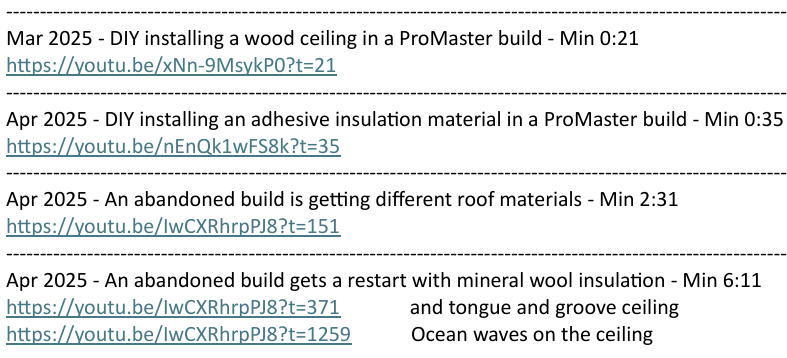 AI Overview: When converting a campervan, the ceiling material plays a crucial role in aesthetics, functionality, and comfort. It needs to be lightweight to preserve fuel efficiency and handling, durable against vibrations and temperature swings, easy to install (especially on curved van roofs), and compatible with insulation for thermal and acoustic performance. Budget, desired vibe (rustic, modern, or minimalist), and headroom preservation are also factors. Most builds start with insulation (e.g., foam boards or spray foam) and furring strips for mounting, then add the finish layer.